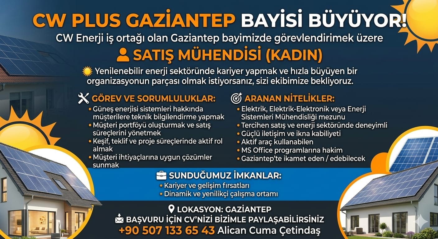 CW Enerji iş ortağı olan Gaziantep bayimizde görevlendirilmek üzere Satış Mühendisi (Kadın) arıyoruz.